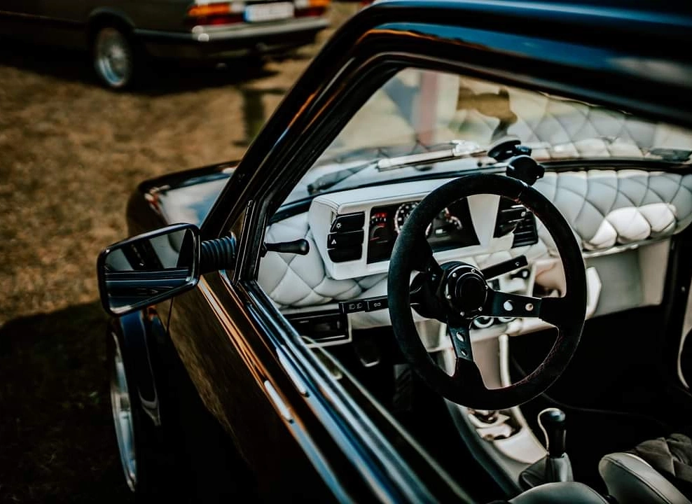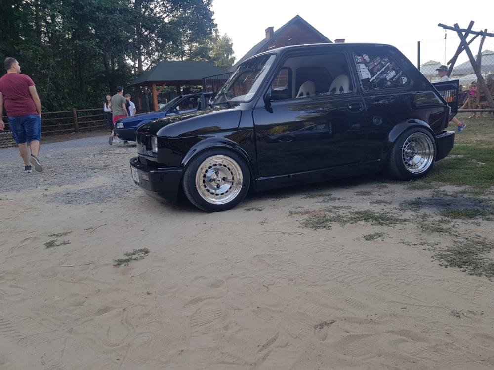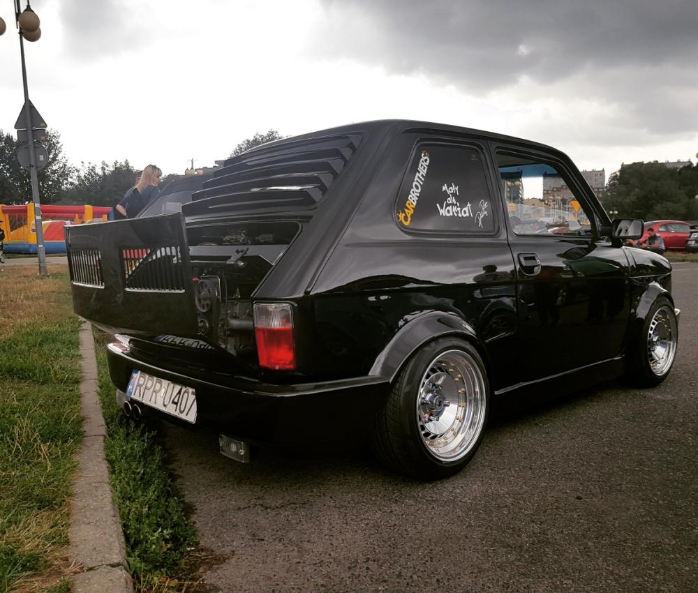 Przedstawiam Fiata 126p który przeszedł face lifting :D Jest to fiat z silnikiem 1.2 z Punto I spięty z 5-cio biegową skrzynią biegów ze starej skody rapid. Zewnętrznie auto zostało poszerzone i pomalowane na kolor czarny z dodatkiem bordowego brokatu . Wnętrze obszyte na nowo białą skóra z dodatkami czarnego.