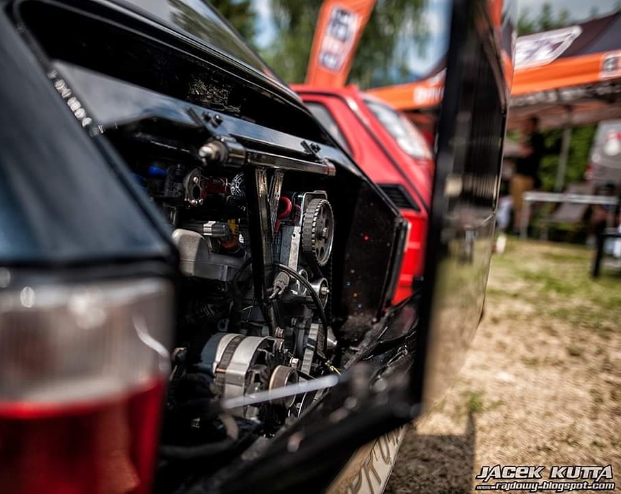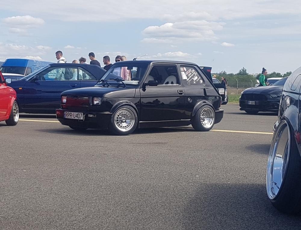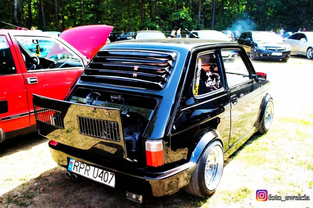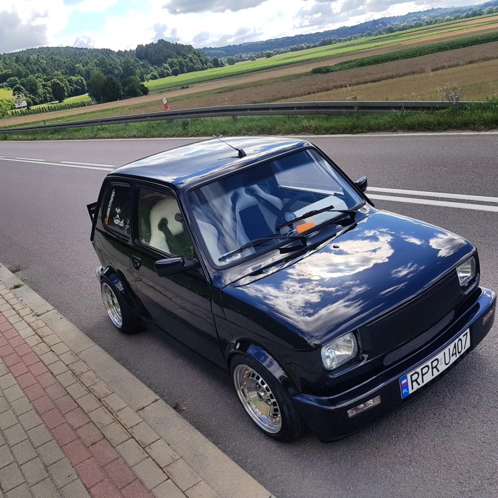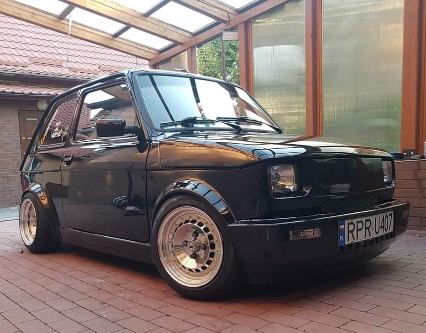 Przedstawiam Fiata 126p który przeszedł face lifting :D Jest to fiat z silnikiem 1.2 z Punto I spięty z 5-cio biegową skrzynią biegów ze starej skody rapid. Zewnętrznie auto zostało poszerzone i pomalowane na kolor czarny z dodatkiem bordowego brokatu . Wnętrze obszyte na nowo białą skóra z dodatkami czarnego.