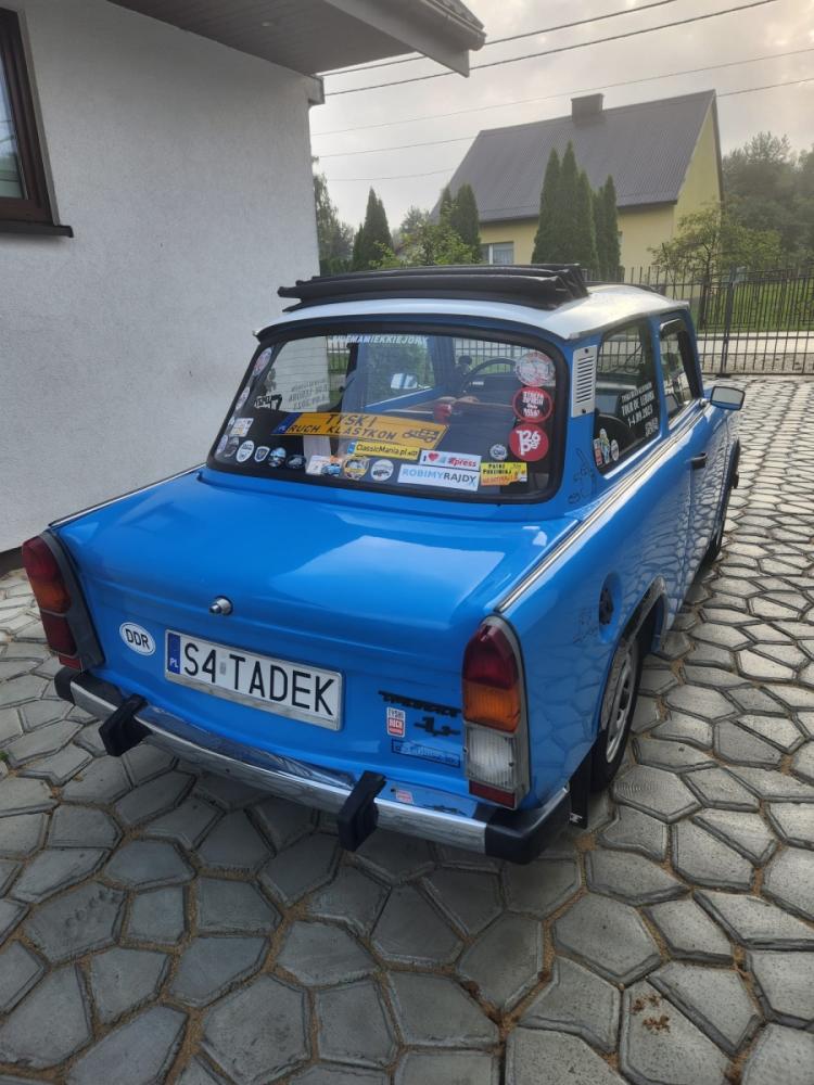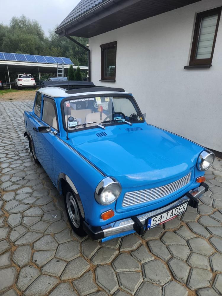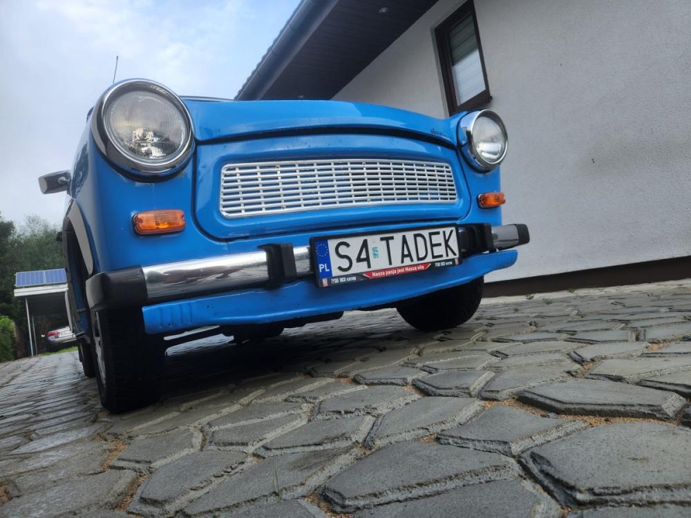 Tadek... a właściwie Trabant 1.1 zjechał z taśmy montażowej w 1991 roku. Jest ostatnią odsłoną tej DDR-owskiej myśli technicznej i wyposażony jest w czterosuwowy silnik o pojemności 1043 cm3, który został zbudowany na podstawie dokumentacji zakupionej od VW na początku osiemdziesiątych lat. Jak dla mnie była to reanimacja trupa Zakupiłem go całkiem przypadkowo we wrześniu 2021 roku w okolicach Bochni od człowieka, który pasjonuje się odbudową starych samochodów. Szukałem Fiata 125p ale żaden nie spełniał moich oczekiwań w założonym budżecie. I tak na powrocie z oględzin kolejnego fiata trafiłem na Tadka. Zaraz po zakupie w drodze powrotnej (oczywiście na kołach) padł alternator i dalszą podróż kontynuował na lawecie. Następnego dnia otrzymał nowy. Trabancik był wyposażony w instalację LPG i tak jeździłem przez rok ponieważ na benzynie nie było jazdy. Dopiero po regeneracji gaźnika instalacja LPG została zdemontowana a miejsce butli zajęła basstuba Jak to Trabant 1.1 mój również był wyposażony w plastikowe zderzaki, które nijak nie pasowały do całej reszty. W związku z tym, że grill był zamontowany od wersji 601 nie miałem skrupułów aby zamontować chromowane zderzaki, lusterka i ranty nadkoli. Według mnie komponuje się to bardzo dobrze chociaż niektórzy "Trabanciarze" byli odmiennego zdania. Tadek jest użytkowany dość intensywnie (jak na taki samochód oczywiście). Nie bał się wyjazdu w góry, a najdłuższą wycieczką był wypad na Hel (trasa Wanaty - Hel - Wanaty = 1100km). Mało kto wierzył że dojedzie ale Tadek dzielnie pokonywał kolejne kilometry mijając kilkunastoletnie fury, które nie wytrzymały upału stojąc w korku. W styczniu otrzymał nową uszczelkę głowicy... nie nie... nie wydmuchało tylko delikatnie zaczął się sączyć olej, a to chyba nie wypada. Na dzień dzisiejszy jest w 100% sprawny, pali z półobrotu i wiezie mnie tam gdzie tylko chcę